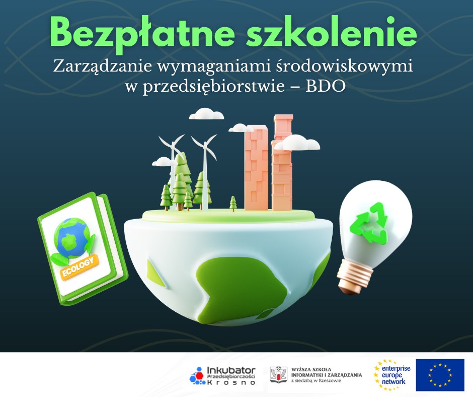 Enterprise Europe Network oraz Inkubator Przedsiębiorczości Krosno zapraszają na bezpłatne szkolenie pn. “Zarządzanie wymaganiami środowiskowymi w przedsiębiorstwie – z uwzględnieniem bazy danych o produktach i opakowaniach oraz o gospodarce odpadami (BDO). Szkolenie odbędzie się 4 grudnia br. w Inkubatorze Przedsiębiorczości Krosno, ul. Żwirki i Wigury 15.